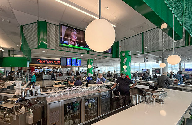 Constructed for Jackmont Hospitality, the restaurant occupies a large open space at the far end of Terminal D. Featuring commanding views of the airfield, friendly service, and a menu that satisfies hungry travelers, Middle Child was an instant hit when it opened in September 2025. The atmosphere in the brightly colored and well-lit space is lively, with monitors conveniently displaying flight information, news and entertainment programs.